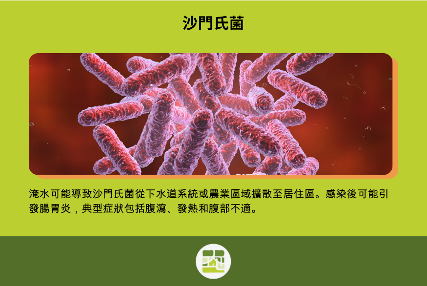 大腸桿菌水源污染的主要指標之一。普遍存在於人類和動物的消化系統中,但某些特定菌株可能引發腸胃不適,包括腹瀉、嘔吐和發熱等症狀。在淹水情況下,受污染的水可能將大腸桿菌帶入居住區域或公共場所。 - 沙門氏菌(Salmonella)
