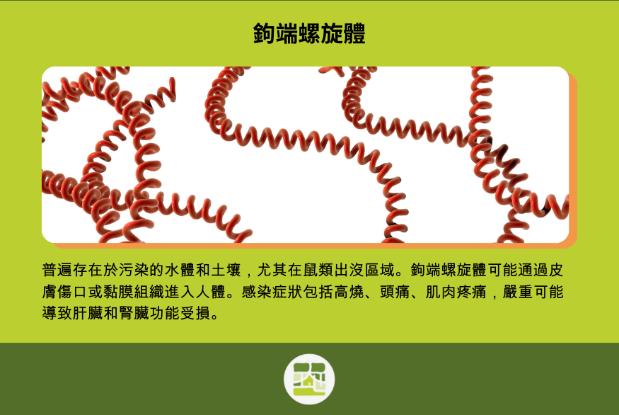 這種細菌常見於受污染的食物和水源中。淹水可能導致沙門氏菌從下水道系統或農業區域擴散至居住區。感染後可能引發腸胃炎,典型症狀包括腹瀉、發熱和腹部不適。 - 鉤端螺旋體(Leptospira)