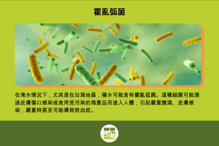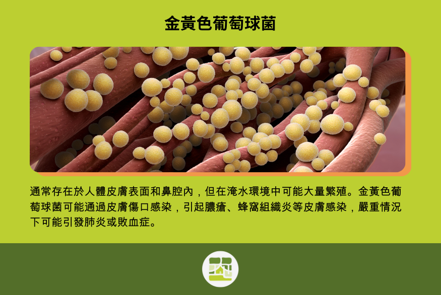 在淹水情況下,尤其是在沿海地區,積水可能含有霍亂弧菌。這種細菌可能通過皮膚傷口感染或食用受污染的海產品而進入人體,引起嚴重腹瀉、皮膚感染,嚴重時甚至可能導致敗血症。 - 金黃色葡萄球菌(Staphylococcus aureus)