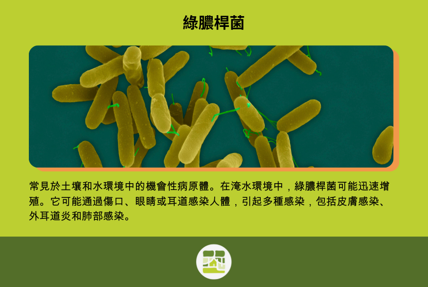 這種細菌通常存在於人體皮膚表面和鼻腔內,但在淹水環境中可能大量繁殖。金黃色葡萄球菌可能通過皮膚傷口感染,引起膿瘡、蜂窩組織炎等皮膚感染,嚴重情況下可能引發肺炎或敗血症。在處理淹水後的環境時,維持良好的手部衛生並避免皮膚直接接觸污水至關重要。 - 綠膿桿菌(Pseudomonas aeruginosa)